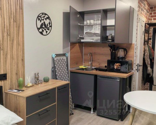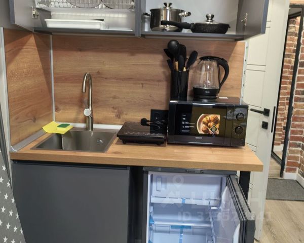 Кухонный уголок оборудован всем необходимым для приготовления пищи: плита, холодильник, микроволновая печь и кухонная утварь.