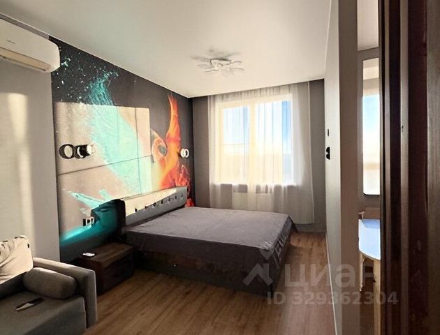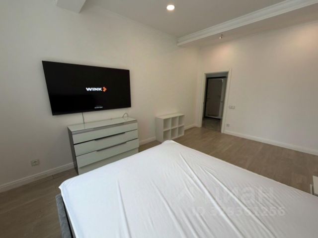 В комнате двуспальная кровать с подъёмным механизмом, комод со стеклянной столешницей, огромный безрамочный телевизор Samsung 4K диагональю 165см (155тр).