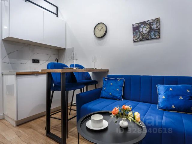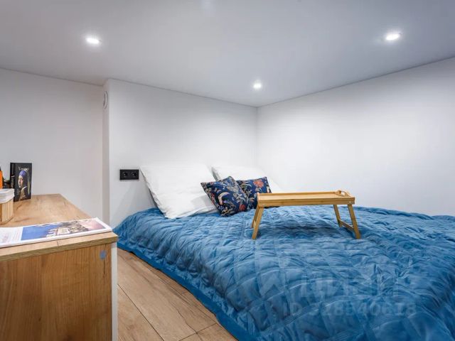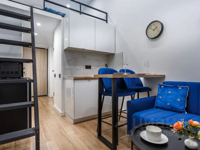 Это двухуровневая квартира-студия, общей площадью 28 кв.м (площадь по полу 19 кв.м.+ 9 кв.м. второй уровень). Потолок, высотой в 4,5 метра и большие светлые окна не смогут оставить вас равнодушными.