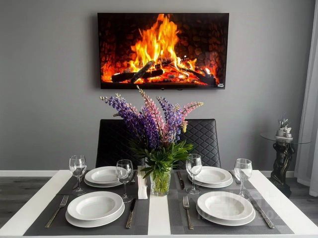 Телевизор, кабельное телевидение для приятного просмотра любимых каналов. Бесплатный высокоскоростной Wi-Fi. Застелено чистое постельное белье для комфортного сна. Свежие полотенца и средства гигиены. Оборудованная кухня, посуда, все для приготовления еды и романтического ужина.