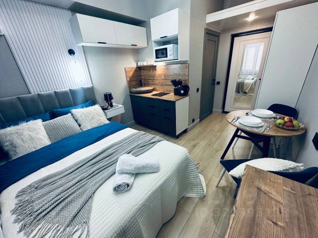 Апартаменты встретят Вас полностью оборудованной и укомплектованной всем необходимым: плита, холодильник, микроволновая печь, электрочайник, фен, утюг, посуда, качественное постельное белье