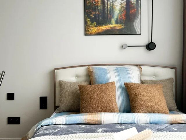 Качественный ремонт и хорошо продуманная эргономика. Вся мебель и предметы интерьера тщательно подбирались. В студии есть: - 2-х спальная кровать, - шкаф для одежды, - кухонный гарнитур, - обеденный стол, - необходимый набор посуды: кастрюля, сковорода, тарелки, ложки, вилки, ножи, штопор, доска для резки; - электрическая плита, - микроволновка, - кондиционер, - прихожая с вешалкой, ковриком и поддоном для обуви.