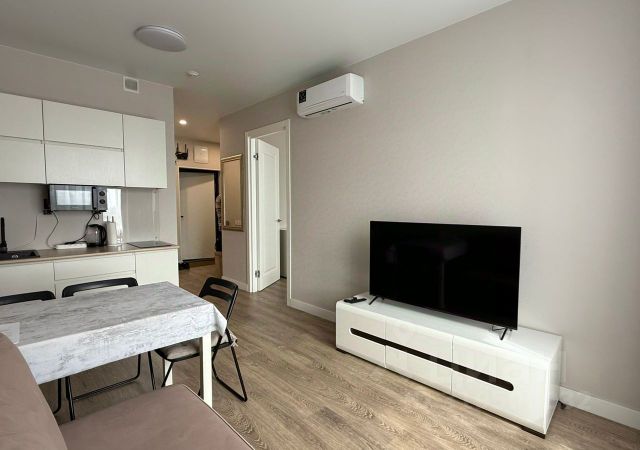 • Гостинная: раскладной диван, телевизор и кондиционер, кухонный стол с двумя стульями и небольшой письменный стол;