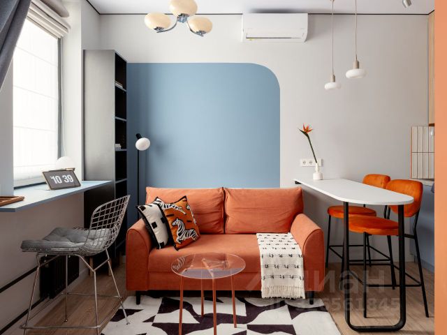 В комнате современный интерьер, комфортный диван-кровать, установлен кондиционер.