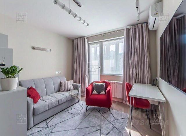 В гостиной зоне установлен диван с ортопедическим матрасом Ormatek, раскладывающийся в полноценную кровать, а также рабочее место для комфортной работы за компьютером, на стене большой телевизор со Smart-TV.