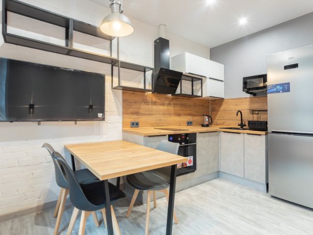 В апартаменте есть все для комфортной жизни: удобный диван раскладывается в полноценную кровать, кухня c обеденным столом, стиральная машина, микроволновая печь, удобное рабочее место, совмещенный санузел с душевой кабиной и современной отделкой.