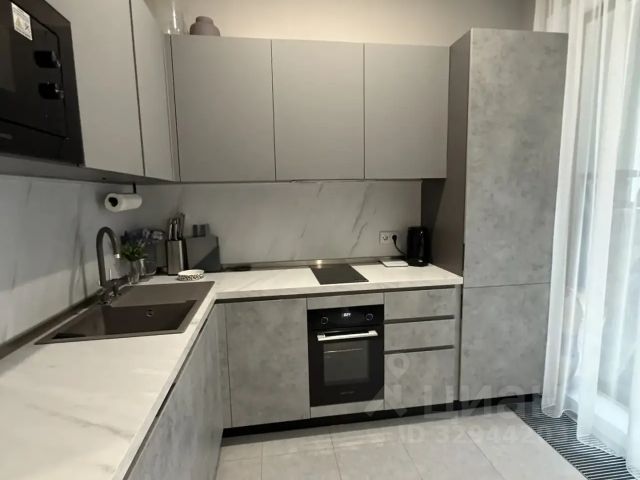 * В кухне 12 м2- угловой встроенный кухонный гарнитур, плита-стеклокерамика, 2-х камерный холодильник, посудомоечная машина, кофеварка.