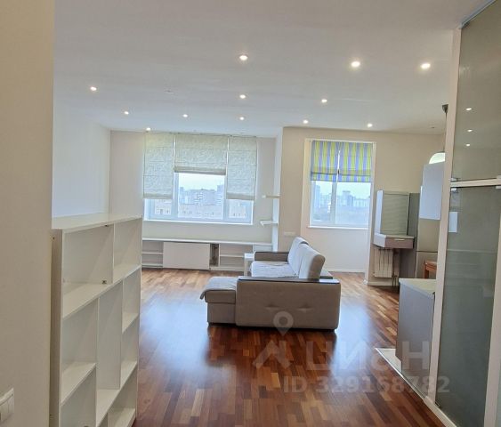 В гостиной зоне установлен диван с ортопедическим матрасом Ormatek, раскладывающийся в полноценную кровать, а также рабочее место для комфортной работы за компьютером, на стене большой телевизор со Smart-TV.