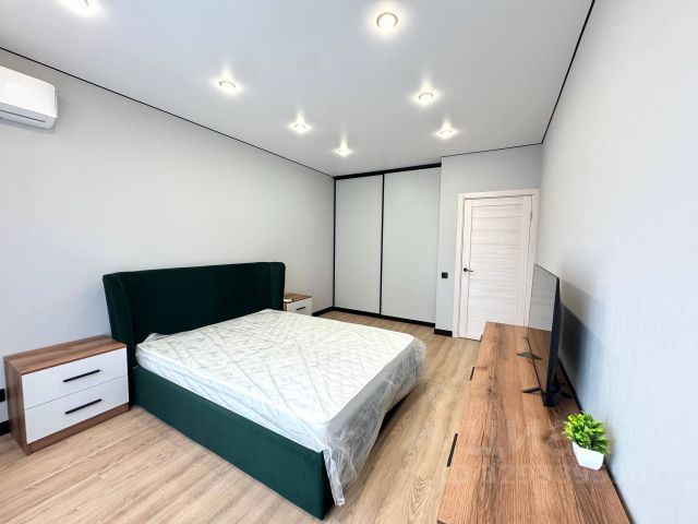 Спальня: двуспальная кровать, ортопедический матрас, угловой шкаф, зеркало.