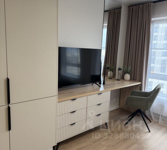 Длинная стильная столешница объединяет всё: здесь и телевизор 55 для вечерних сериалов, и удобное место для ноутбука. А перед рабочей зоной — огромное зеркало до потолка. Удобно собраться перед выходом, проверить образ, сделать селфи или просто наслаждаться ощущением простора, которое зеркало добавляет.