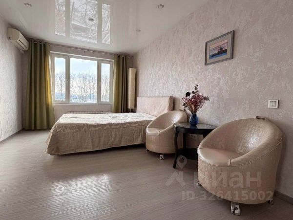Качественный ремонт и хорошо продуманная эргономика. Вся мебель и предметы интерьера тщательно подбирались. В студии есть: - 2-х спальная кровать, - шкаф для одежды, - кухонный гарнитур, - обеденный стол, - необходимый набор посуды: кастрюля, сковорода, тарелки, ложки, вилки, ножи, штопор, доска для резки; - электрическая плита, - микроволновка, - кондиционер, - прихожая с вешалкой, ковриком и поддоном для обуви.