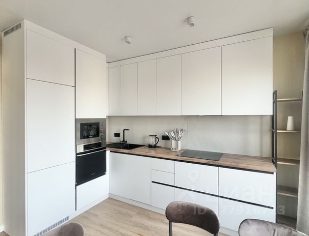 Кухонный гарнитур , встроенной техникой (ЭЛЕКТРИЧЕСКАЯ варочная панель и духовой шкаф, микроволновая печь, холодильник ) обеденный стол с мягкими стульями.