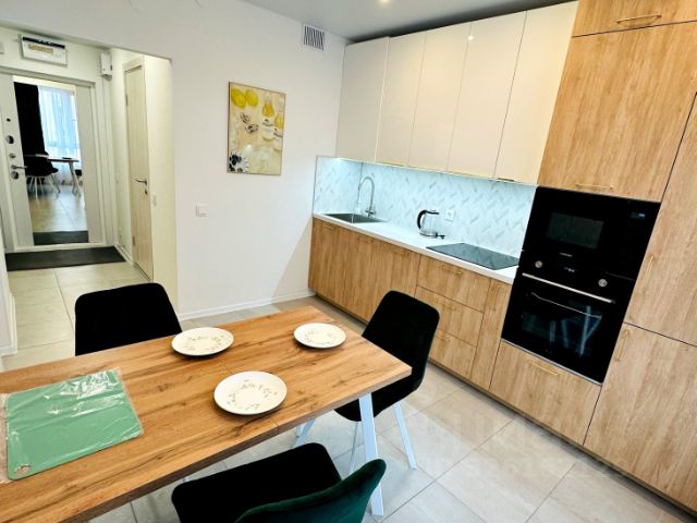 Квартира оборудована кухонным гарнитуром, мебелью и бытовой техникой. Есть холодильник, стиральная машина, электрическая плита, кухонные принадлежности, посуда, столовые наборы и тд.