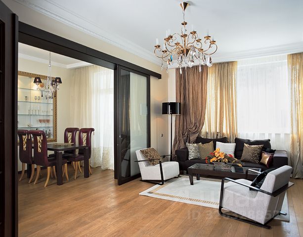 Столовая-гостиная поделена на две зоны: зона гостиной с диваном, который раскладывается на два спальных места, и зона столовой , включающая круглый стол, который раскладывается на дополнительную секцию (трансформируется в овальный) + 4 очень удобных мягких стула.