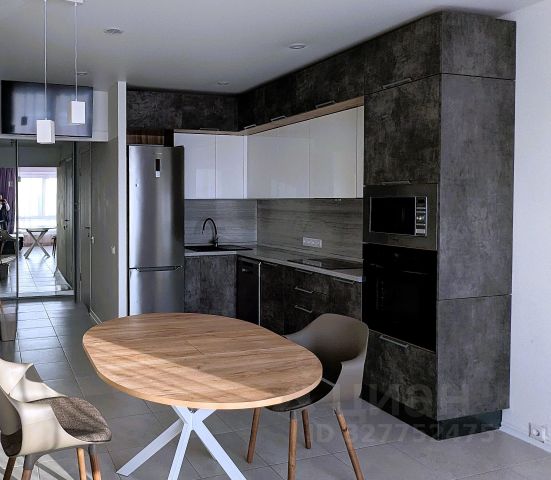 Кухня оборудована встраиваемой бытовой техникой: двухкамерный холодильник увеличенного объема, варочная индукционная панель, духовка с функцией СВЧ, посудомоечная машина, вытяжка.