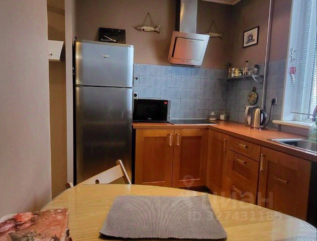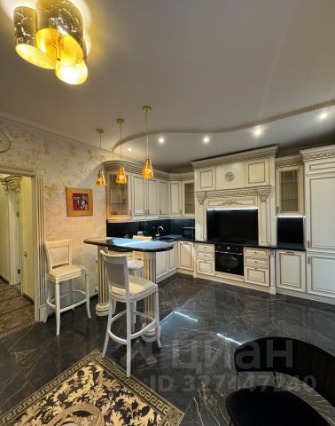 Кухня-гостиная разделена декоративной перегородкой, в зоне кухни гарнитур со всей техникой и посудой, обеденная группа с диваном и стульями. По технике: холодильник большой, двухкамерный, посудомоечная машина, рожковая кофемашина, тостер, СВЧ, индукционная плита и духовой шкаф.