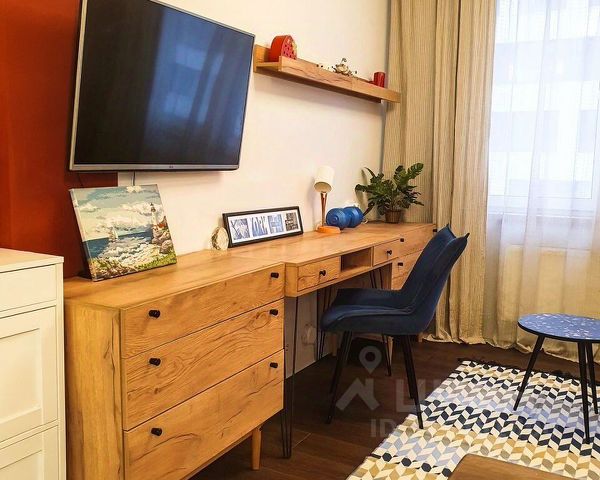 В гостиной расположена вся необходимая мебель: диван-кровать, гардеробный шкаф, тв зона с телевизором и тумбой, а также зона с трансформирующимся столом, который может выполнять функцию рабочего или туалетного столика.