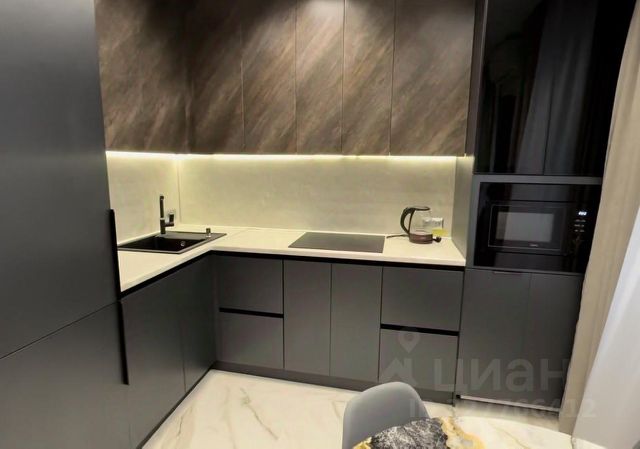 Кухня просторная, с большим кухонным гарнитуром в котором есть вся необходимая встроенная техника: варочная панель с вытяжкой, встроенный духовой шкаф, встроенная микроволновая печь, встроенный холодильник с морозильной камерой и посудомоечная машина.