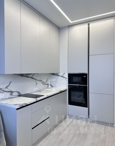 Кухня просторная, с большим кухонным гарнитуром в котором есть вся необходимая встроенная техника: варочная панель с вытяжкой, встроенный духовой шкаф, встроенная микроволновая печь, встроенный холодильник с морозильной камерой и посудомоечная машина.