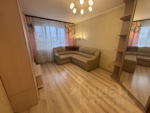 В просторной комнате имеется мягкий уголок, сервант, трюмо, тумба, шкаф для вещей.