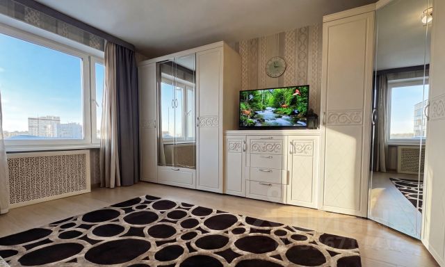 Большие окна и 23 этаж ( без застроек спереди) делают эту квартиру очень светлой, даже в московские серые будни. Солнечная сторона ( солнце приходит после обеда)
