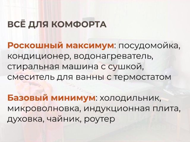 В квартире есть все необходимое для комфортного проживания. Роскошный максимум: посудомойка, кондиционер, водонагреватель, стиральная машина с сушкой, смеситель для ванны с термостатом. Базовый минимум: холодильник, микроволновка, индукционная плита, духовка, чайник, роутер.
