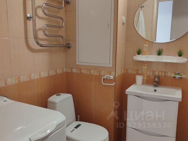В ванной душевая кабина, шкафчик c зеркалом и подсветкой, полотенцесушитель, стеллаж с корзиной для белья.