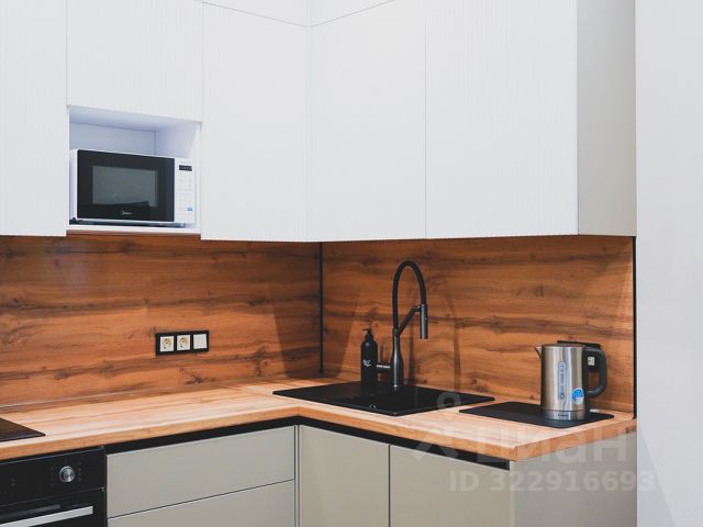 Кухонная зона оснащена техникой для приготовления пищи: микроволновая печь, холодильник, плита, чайник, столовые приборы, кастрюля, обеденный стол.