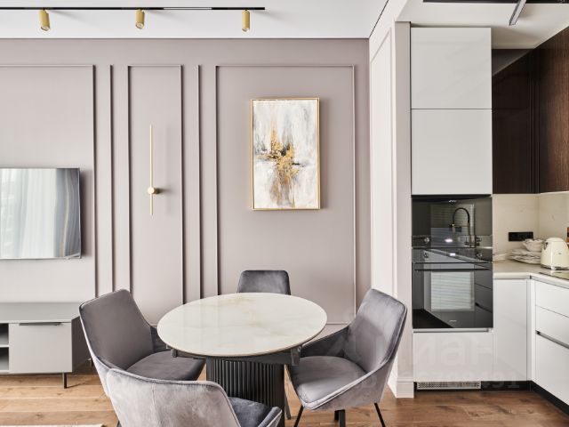 Столовая-гостиная поделена на две зоны: зона гостиной с диваном, который раскладывается на два спальных места, и зона столовой , включающая круглый стол, который раскладывается на дополнительную секцию (трансформируется в овальный) + 4 очень удобных мягких стула.