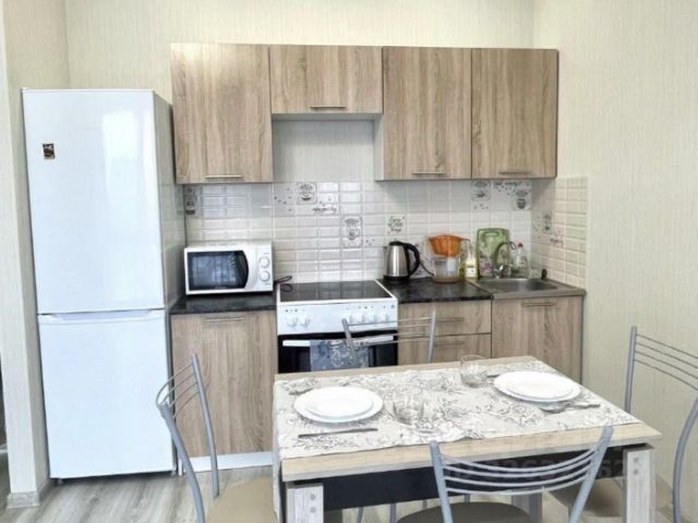 Просторная кухня- гостиная: обеденная зона, посудом. машина, вытяжка, электроплита и духовой шкаф Electrolux, TV, СВЧ, чайник, кухонные принадлежности, посуда.