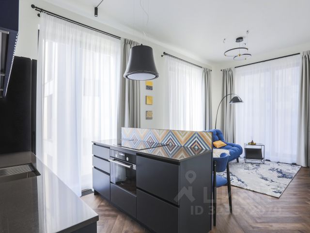 Квартира с 1-й спальней расположена на 3 этаже исторической высотки на Красных воротах вблизи Лермонтовского сквера. В квартире площадью 64 м² выполнен современный дизайнерский ремонт с использованием дорогостоящих материалов, интерьер оформлен в теплых оттенках и декорирован элементами лепнины. В квартире спланировали просторную кухню-гостиную с выходом на балкон, уютную спальню, санузел с душевой кабиной и холл с системами хранения вещей. Квартира оснащена бытовой техникой Gaggenau, Miele, сантехникой Antonio Luppi и кондиционерами. Из окон открываются виды на улицу.
