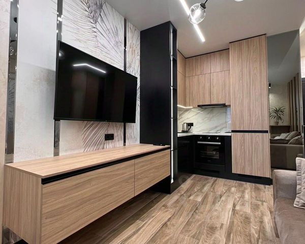 * Гостиная совмещённая с кухней, организована по принципу открытого пространства, идеально для уютного отдыха и приёма гостей. Новый раскладной ортопедический диван, журнальный столик, тв тумба и смарт тв 65 дюймов 4к.