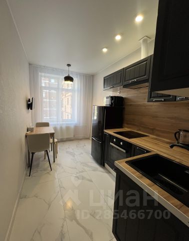Зал/кухня 21 м2, окна в пол, удобная эргономичная кухня, встроенная стиральная машинка, раскладной диван, стол, стулья, книжные полки.