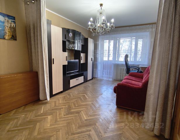 Большая комната: модульная стенка, стол и стул, двуспальный раскладной диван, раскладывается и получается спальное место 160*200, панорамные окна во двор с видом на лес (север, запад).