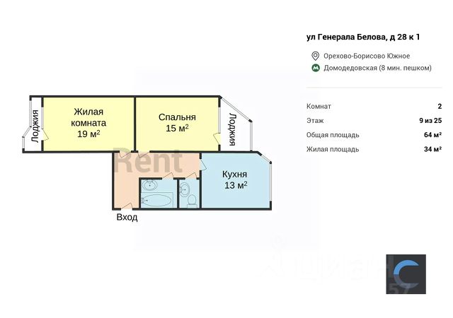 ПРЕДЛОЖЕНИЕ БЕЗ КОМИССИИ. 500 метров от метро! Светлая просторная 60м2 квартира. Изолированные комнаты - 19м2 и 15м2, кухня 13м2. Просторный холл. Квартира меблирована и оборудована необходимой бытовой техникой. Окна - пластиковые стеклопакеты, остекленная лоджия. Санузел оборудован качественной европейской сантехникой. Развитая инфраструктура района: сетевые супермаркеты, кафе, ТРК "Облака", Домодедовский рынок, фитнес-клубы, бассейн и пр. В 10 минутах на авто располагаются живописный Царицынский лесопарк и благоустроенная зона отдыха Борисовские пруды. Предложение для арендаторов без домашних животных. ПРЕДПОЧТЕНИЕ: 2 ПАРНЯ или 2 ДЕВУШКИ. Сдается 2-комнатная квартира рядом с метро Зябликово.