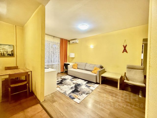 Квартира укомплектована необходимой мебелью и техникой.. Гостиная совмещена с кухней и отдельная изолированная спальная. Окна смотрят на Юго - Запад. На длительный срок.
