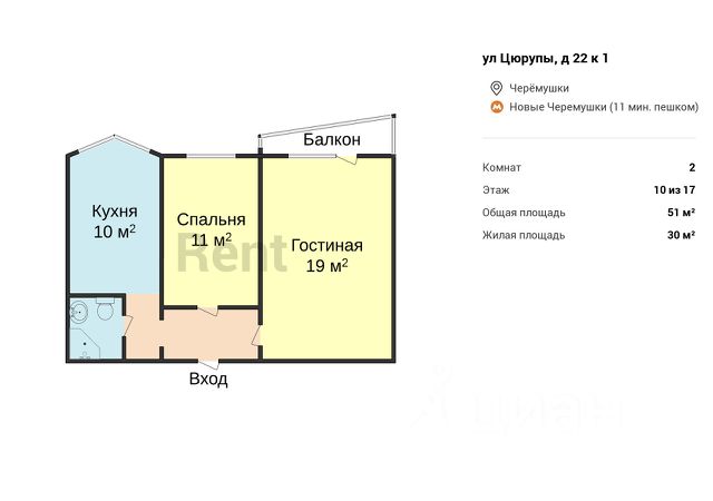 • ✓ В базе Циан 4 2-комнатных квартир на улице Цюрупы в Москве.