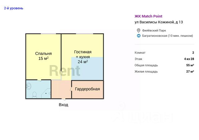 Доступно заселение на следующий рабочий день после обращения! Предлагается в аренду 2-комнатная квартира 4197 с евро планировкой (кухня-гостиная + 1 спальня), высокими потолками площадью 61 м2, расположенная на одиннадцатом этаже нового арендного дома класса Матч Поинт. Окна апартаментов выходят на улицу Василисы Кожиной. Современный эргономичный дизайн, мебель европейского производства, вся необходимая техника, разработанная с использованием умных технологий. Просторная кухня-гостиная оснащена встроенной техникой фирмы Hotpoint: 2-х камерным холодильником, варочной 4-х комфорочной панелью, духовым шкафом, посудомоечной машиной и вытяжкой. При входе в апартаменты вместительная гардеробная комната (5,2 м2), пуф, массив которого выполнен из бука и хвойных пород, материал обивки - ткань "гусиная лапка", панель вешалка. Зона кухни оборудована комплектом кухонной мебели с деревянными фасадами благородного шоколадно-коричневого цвета, стильной барной стойкой и барными стульями на две персоны. В апартаментах предусмотрены два спальных места: в гостиной двуспальный раскладной диван (190 см * 150 см, механизм "еврокнижка", тканевая обивка Casain piain); в спальне большая кровать (180 см * 200 см) с мягким изголовьем и матрасом, выполненным из бельгийского материала с ортопедическим эффектом. Благодаря 5-ти зональному пружинному блоку матраса Ваш позвоночник будет получать превосходную поддержку. Помимо кровати в спальне из мебели есть прикроватные тумбочки со стильными подвесными светильниками над ними, шкаф (вся мебель фирмы Permo, Италия). Чтобы ничего не отвлекало от здорового сна - плазменный TV от Panasonic с TV тумбой дизайнеры разместили в гостиной. Для Вашего комфорта в каждой комнате установлен кондиционер. На окнах помимо тюли есть портьеры Design&Colors, SOLKLIMA DESEN. Совмещенный санузел оборудован душевой кабиной и раковиной, вместительной и удобной в использовании стиральной машиной, большим зеркалом с подсветкой. Разрешено проживание с животными! Территория "Матч Поинт" закрытая, установлено видеонаблюдение и действует система электронных пропусков. В доме отапливаемая подземная парковка. Район с развитой инфраструктурой - вблизи множество парков, больниц, фитнес-центров, вузов и супермаркетов. Не менее развита транспортная сеть. Арендный дом расположен на Кутузовском проспекте: 10 минут пешком до станции метро "Багратионовская", в 5 минутах на автомобиле до Москва-Сити. Поблизости ТРЦ "Афимолл", "Филион", "Времена Года". Большой выбор парков для прогулок: Парк Победы, Филевский парк, Природно-исторический парк Москворецкий. Услуги 24/7 ВКЛЮЧЕНЫ В АРЕНДНУЮ ПЛАТУ! (прием корреспонденции, заявок на ремонт, выдача гостевых пропусков и т.д.). Удобный и доступный сервис дополнительных услуг: уборка, стирка, глажка, а также присмотр за животными и др. При заселении оплачивается стоимость аренды за первый месяц. При заключении договора аренды до 30 апреля доступна рассрочка оплаты депозита на 3 месяца! Дополнительно оплачиваются только счетчи Сдается 2-комнатная квартира на улице Василисы Кожиной в Москве.