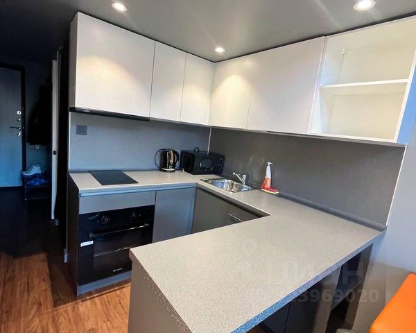 оборудованная кухня с варочной панелью, духовкой, микроволновкой, холодильником и электрическим чайником;