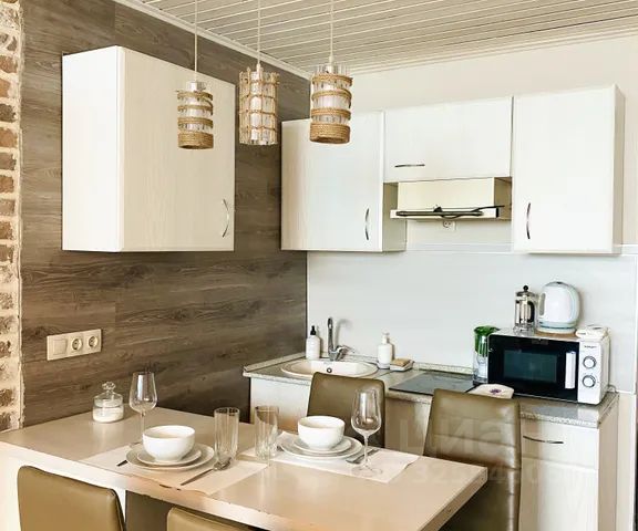 - Кухня-гостиная с раскладным Г-образным диваном, барной мраморной стойкой и домашний кинотеатр с проектором