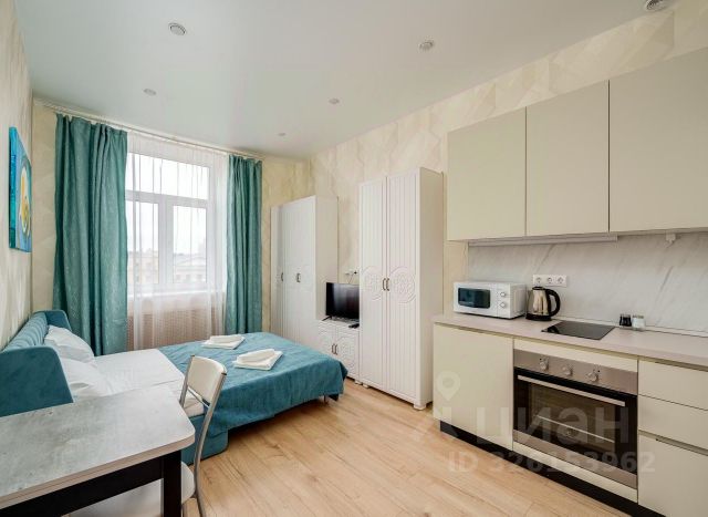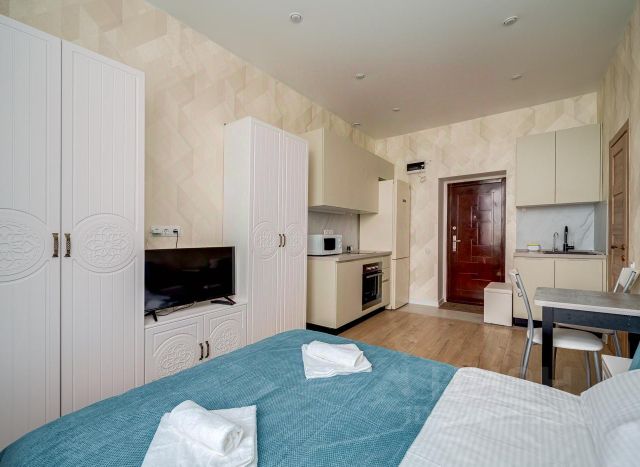 Студия подойдет для проживания 2 гостей. В апартаментах есть все для комфортного проживания: двуспальный диван 160 на 200, SMART-TV и высокоскоростной Wi-Fi, стиральная машинка, утюг, гладильная доска, сушилка для белья, фен. Мини-кухня оснащена холодильником, индукционной варочной панелью, СВЧ-печью, электрическим чайником, необходимой посудой и столовыми приборами. Постельное белье, полотенца, шампунь, гель для душа, жидкое мыло предоставляются.