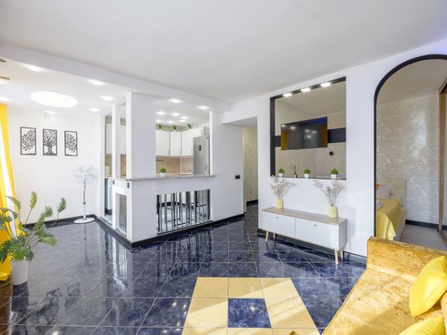 В квартире могут разместиться до 4-х гостей: имеется двуспальная кровать и раскладной двуспальный диван, письменный и обеденный столы.