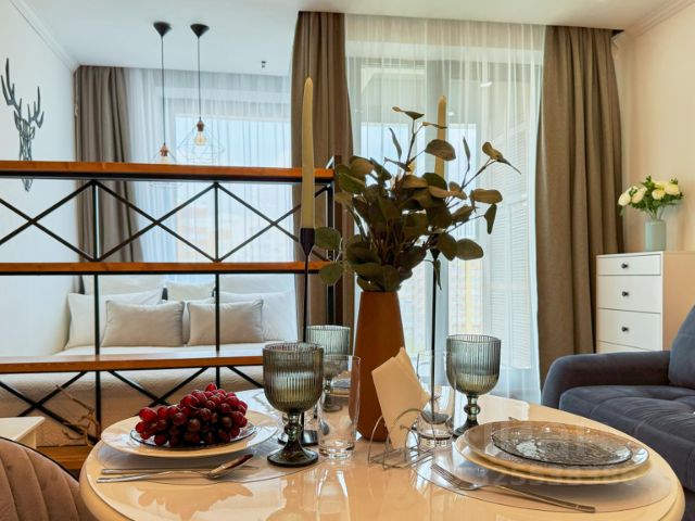 в спальной зоне: постельное белье, двуспальная кровать (размер матраса 160*200) с тумбочкой и розетками, постельное белье, вместительный шкаф, обустроенная лоджия;в гостиной: раскладной диван 160*200, журнальный столик;кондиционер, телевизор Smart TV, Wi-Fi;в кухонной зоне: фильтр для воды, капсульная кофемашина, электрочайник, индукционная плита, духовка, вытяжка, микроволновка, посудомоечная машина, вся необходимая посуда, чай, кофе, сахар, соль;в ванной зоне: душевая кабина, фен, зеркало с подсветкой, стиральная машина, сушилка, комплект полотенец, одноразовый убн