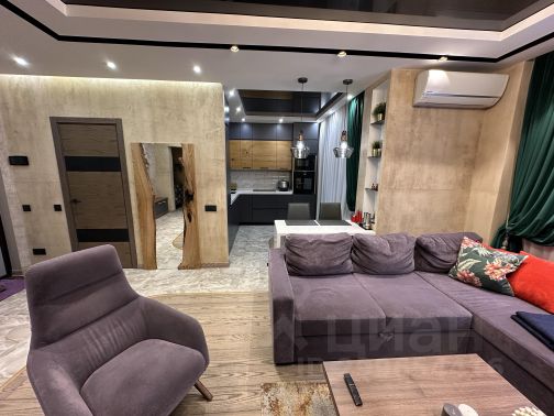 В ГОСТИНОЙ кондиционер, смарт-ТВ, диван, кресло, торшер, бельгийский шерстяной ковер, винтажный журнальный стол, красивая пальма. Мы также сделали различные сценарии освещения.