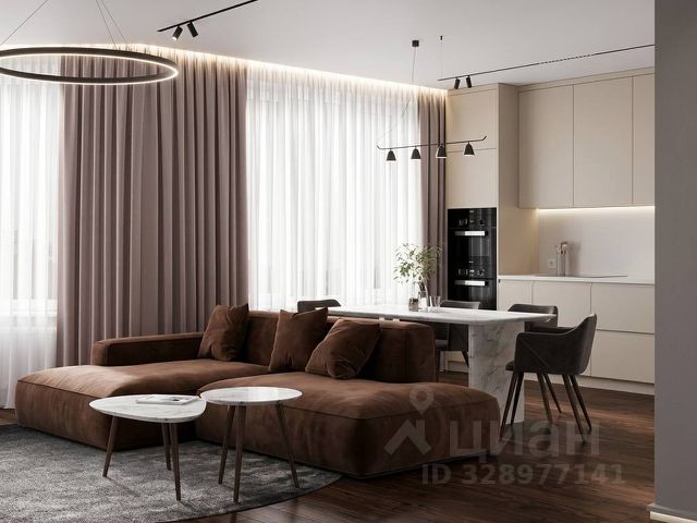 Полностью мебелирована: дизайнерский светлый угловой диван (раскладывается в двуспальное место и имеет систему хранения), дизайнерский стол из дерева на 6 персон, стулья дизайнерские букле, кондиционеры, кухня, стиральная машина, холодильник, посудомоечная машина, микроволновка, духовой шкаф, индукционная варочная панель.