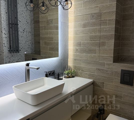 - Ванная комната: подвесная тумба с двумя отсеками, настенная полка, зеркало с подсветкой настенное, стиральная машина, ванная.