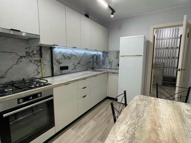 * Кухня - наборный гарнитур с техникой (двухкамерный холодильник, электрическая плита) и обеденной зоной (раскладной стол, 2 стула), ЖК-телевизор.
