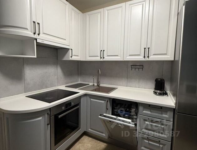Кухня встроенная, имеет варочную электрическую плиту с стеклокерамической поверхностью и сенсорным управлением в доме газа нет, духовой шкаф, столешница с встроенной мойкой из камня, большой холодильник, микроволновая печь, эл. чайник.