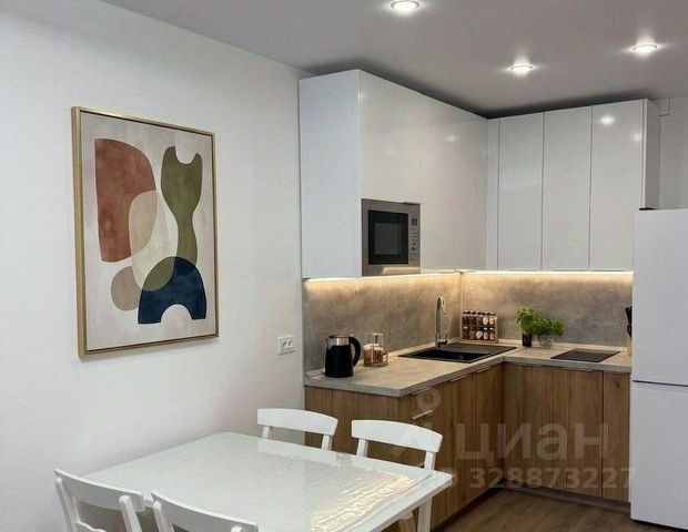 Современная лаконичная кухня оборудована полным комплектом встроенной техники - холодильник, индукционная варочная поверхность, духовой шкаф, посудомоечная машина и вытяжка. Обеденная группа с отдельным освещением идеально дополняет кухонную зону, а большая площадь позволяет установить большой стол для приема гостей или диван.