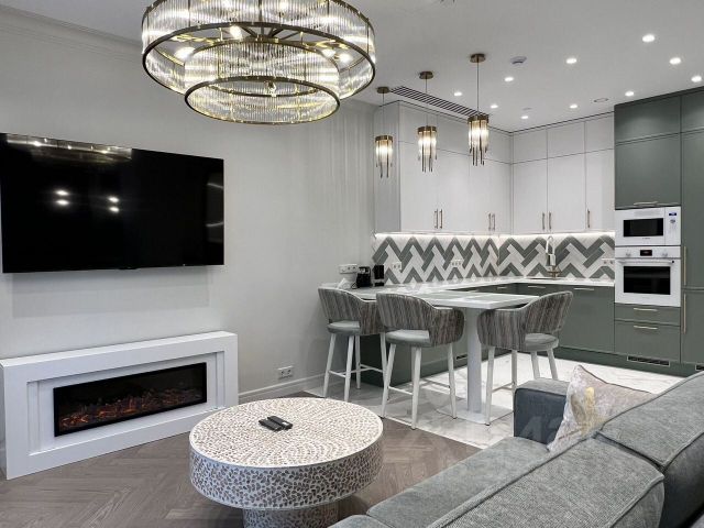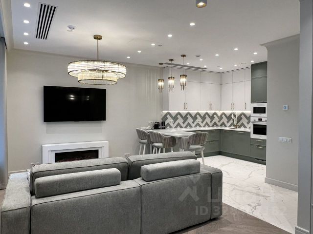 Просторная гостиная с техникой B&O (ТВ на тросах и акустическая система), французской мягкой мебелью Ligne Roset в самой дорогой отделке алькантарой и натуральной кожей, с лепниной из настоящего гипса, выполненной по спецзаказу, гигантской американской хрустальной люстрой в металле "Restoration hardware", с принтами на стенах от французского художника Louis Vuitton.